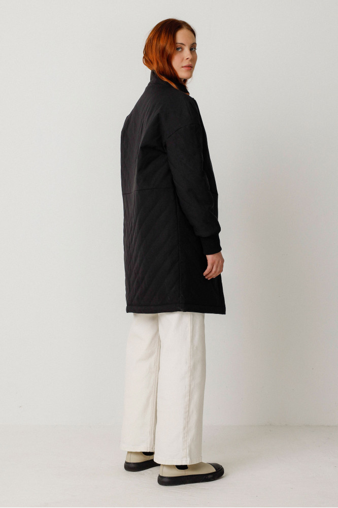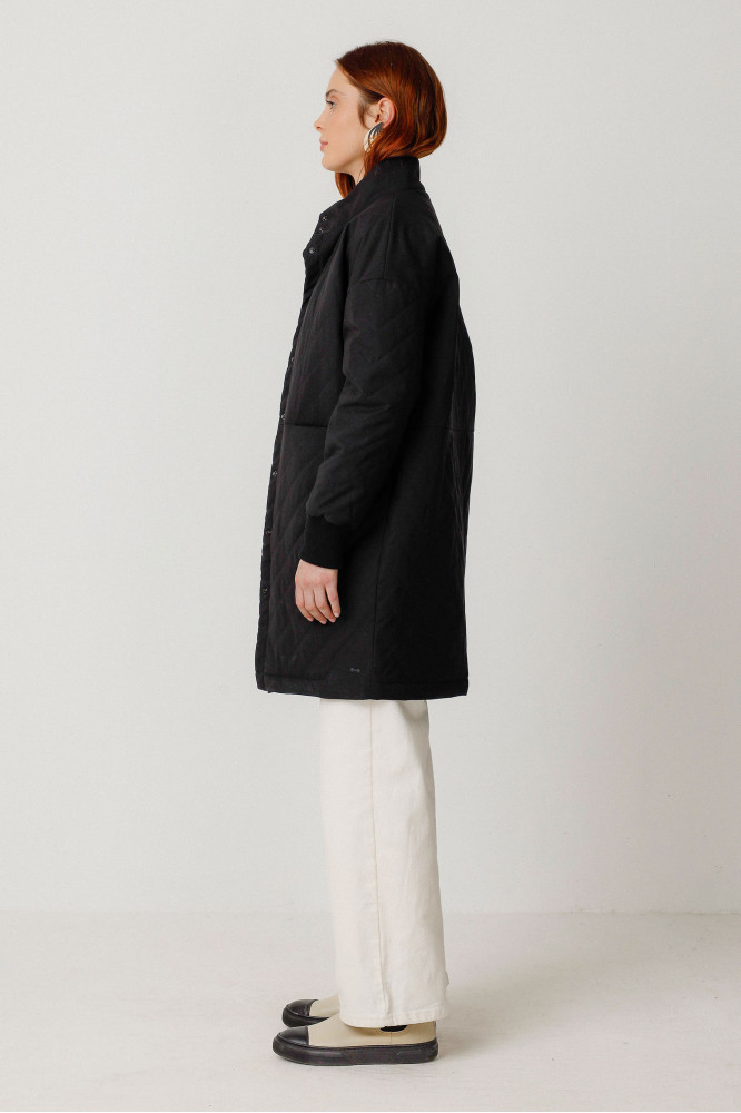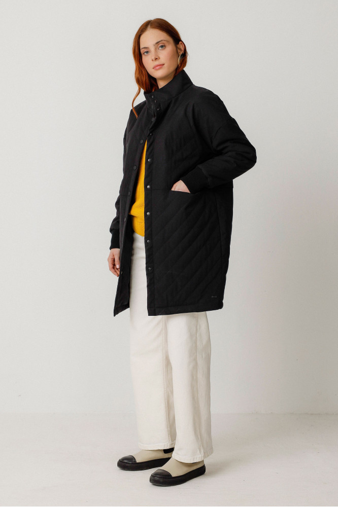 Cocoon-shaped button-down coat with a loose fit, stand-up collar, and long sleeves with ribbed cuffs. It has front pockets, is fully lined, and includes Sorona padding.