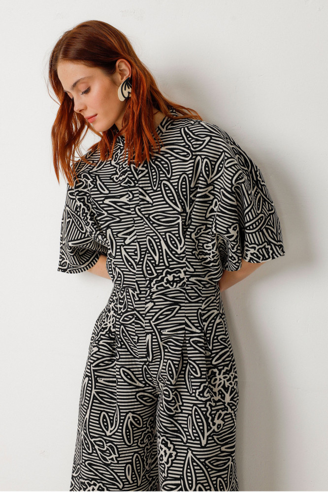 Palazzo jumpsuit with a Mao collar, flared short sleeves, side pockets, front zip closure, and woven jacquard fabric. Offers a chic, on-trend look that’s comfortable to wear.