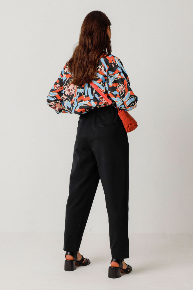 Ankle-length carrot trousers with a standard waist, with elastic at the back, and back fake welt pockets, combining comfort with a modern look.