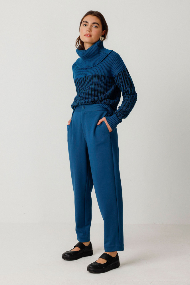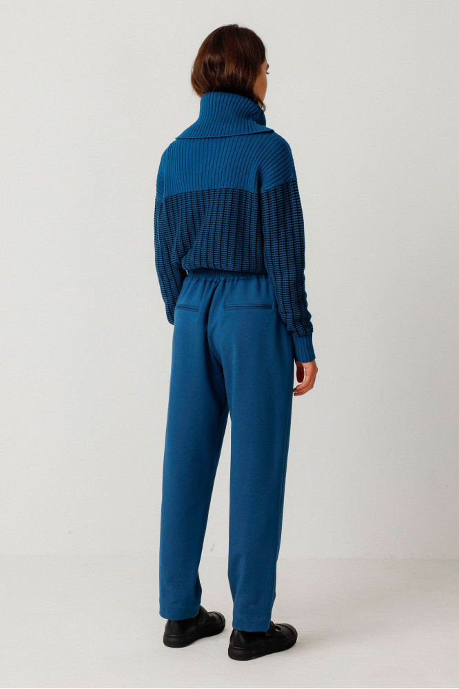 Ankle-length carrot trousers with a standard waist, with elastic at the back, and back fake welt pockets, combining comfort with a modern look.