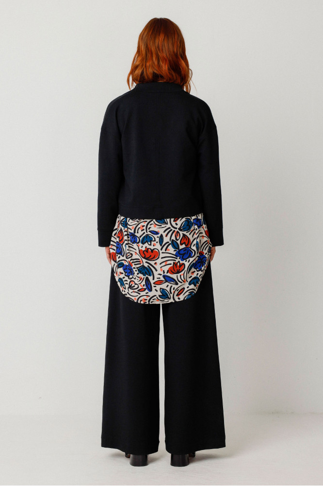 Relaxed fit jacket with a V-neck, dropped shoulders, long sleeves, front pockets and front zip closure. Combines comfort with practicality.