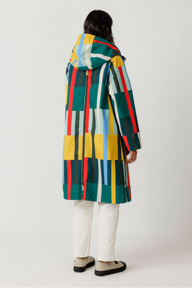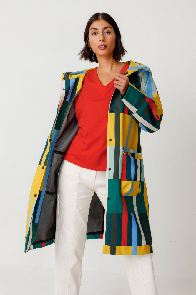 Knee-length A-line raincoat with raglan long sleeves, patch pocket with flap, front snap button closure and waterproof design. Offers both style and practicality with a joyful multicoloured print.