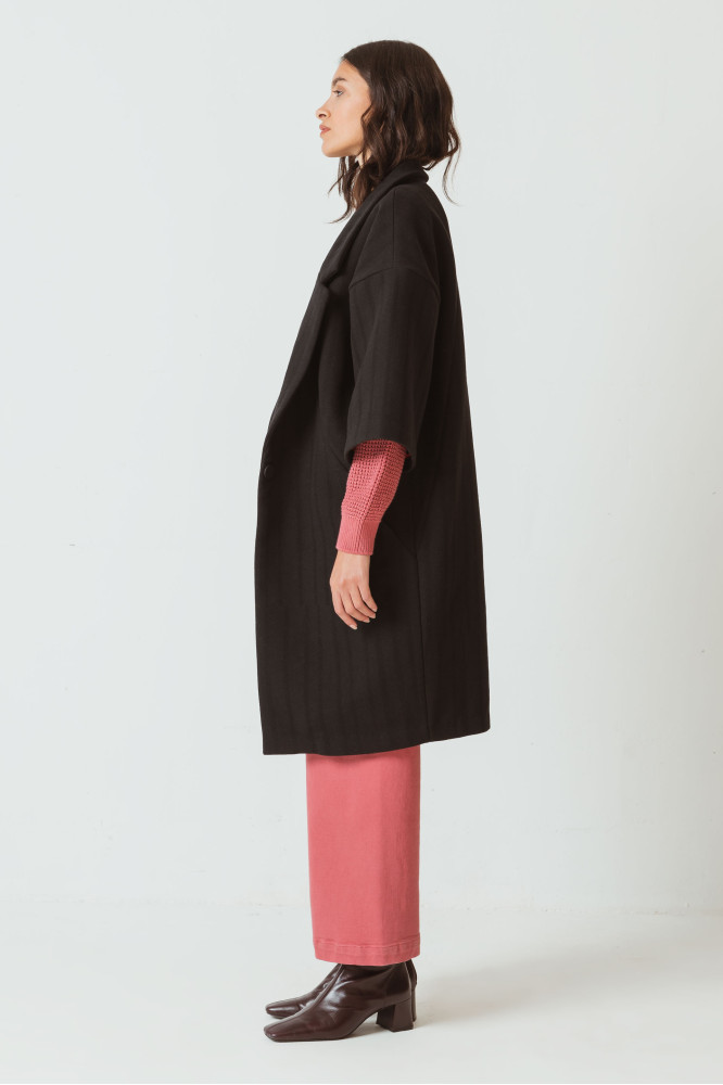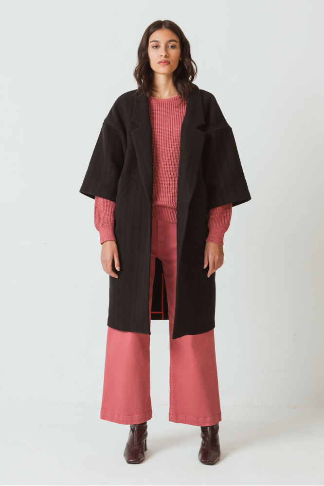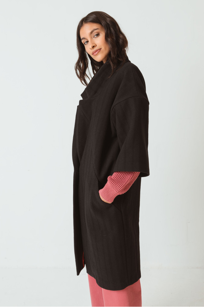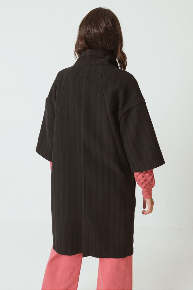Mullido abrigo amplio hecho con un suave tejido de mezcla de lana. Tiene el cierre abotonado con cuello esmoquín, mangas 3/4 de estilo kimono y bolsillos para las manos. Negro.