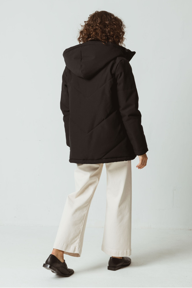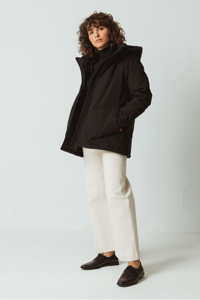 Chaqueta acolchada de corte recto con cuello alto hecha de poliéster reciclado con un relleno Sorona. Sus mangas largas se rematan con unos puños acanalados anchos, lleva una capucha ajustable y extraíble en el cuello y en la parte delantera tiene dos bolsillos y cierre de cremallera con dos cursores. Impermeabilidad 5000 mm, transpirabilidad 3000 g / m2 / 24 h. Tratamiento hidrófugo sin PFC. Negro.