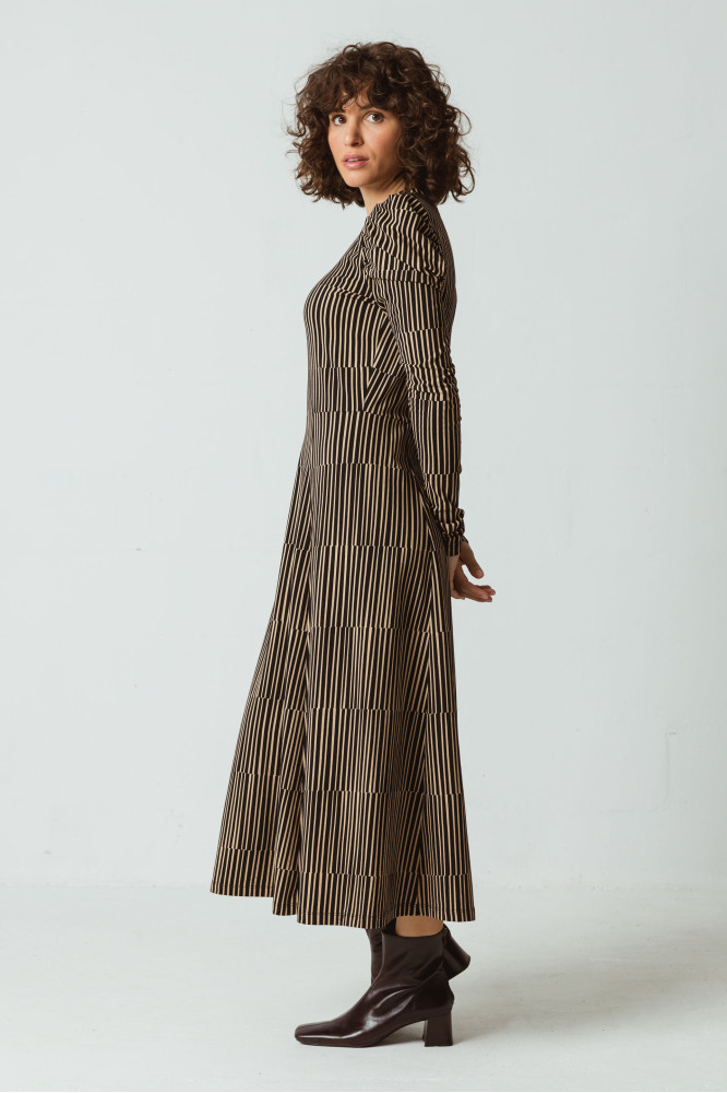 Vestido largo de algodón orgánico stretch de manga larga y cuello redondo. Estampado negro.