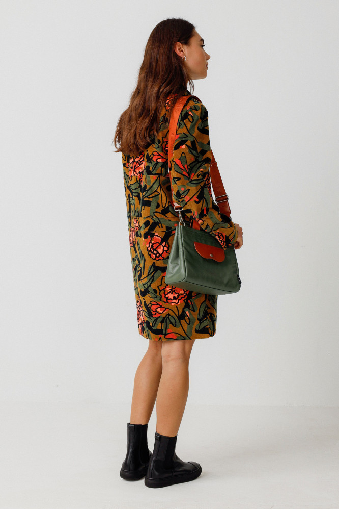 Bolso shopper de piel y algodón reciclado con bolsillos delanteros y traseros, correa ajustable y desmontable, cierre de cremallera y botones a presión para ajustar el tamaño. Con un bolsillo interior y forro estampado, mide 250 x 200 x 150 mm.
