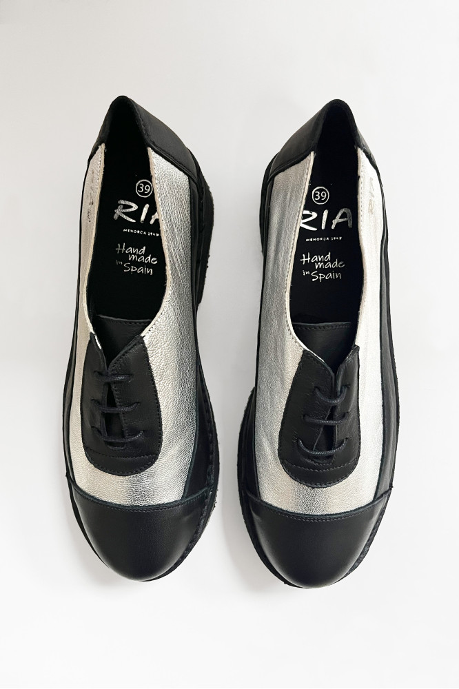 Zapatos de piel en colaboración con RIA MENORCA. Estos zapatos se diseñaron para la edición de febrero de la MBFWM usando polvo de neumático reciclado SIGNUS en la suela.
