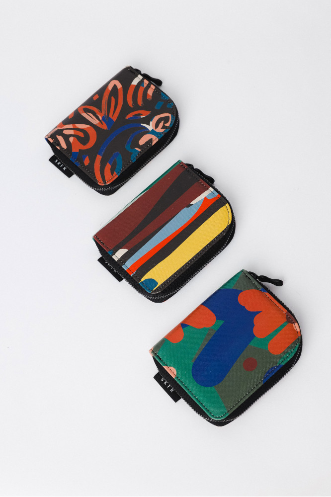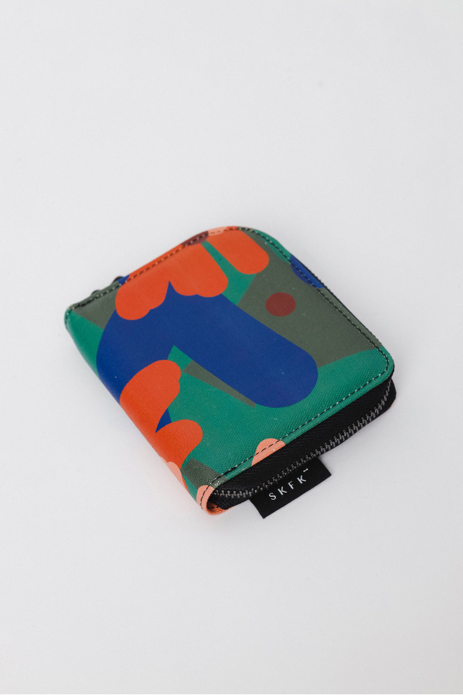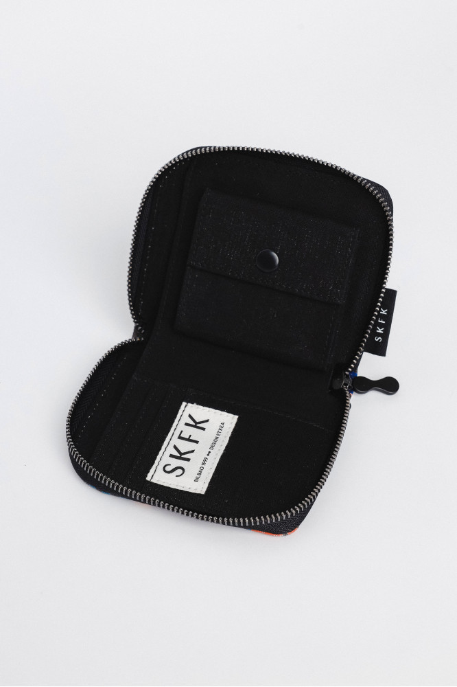 Cartera de algodón reciclado con cierre de cremallera, tarjetero interior y bolsillo monedero. Combina sostenibilidad con funcionalidad.