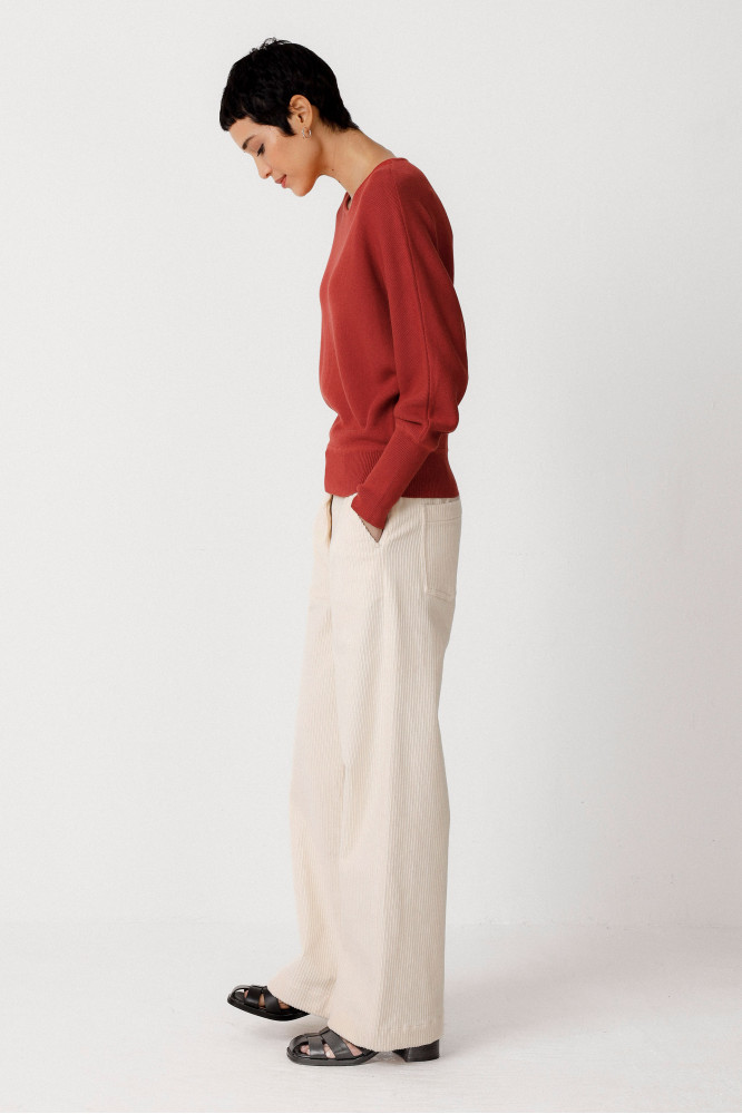 Suéter de punto bobo de cuello redondo y mangas dolman. Una prenda cómoda y desenfadada sin cierre. Algodón orgánico con certificado GOTS.