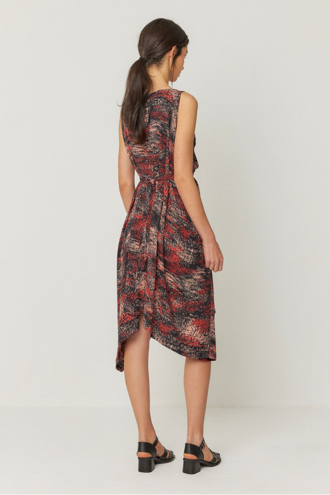 Vestido hasta la rodilla. Cuello redondo, sin mangas y multiposición. Diseño zero waste, talla única.