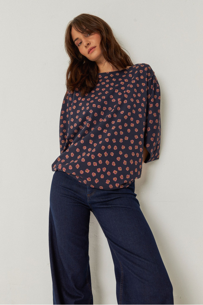 Camiseta holgada con cuello barco y mangas de murciélago. Diseño cero residuos, talla única.