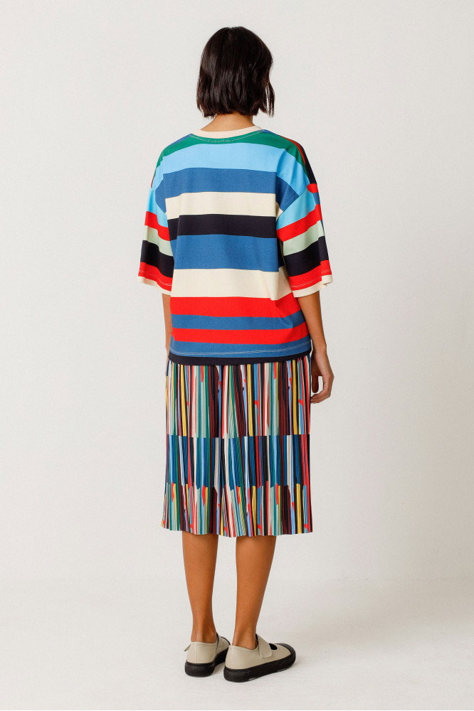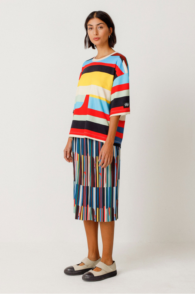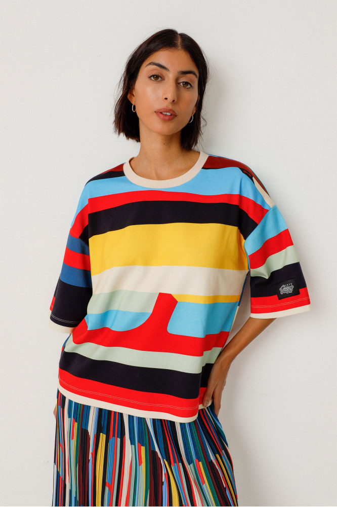 Camiseta de cuello redondo y manga corta con un estampado distintivo. Algodón orgánico con certificado GOTS. Colaboración con Grems.