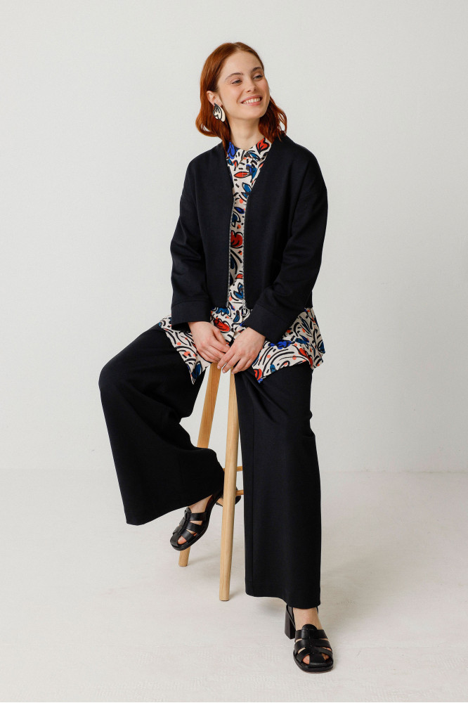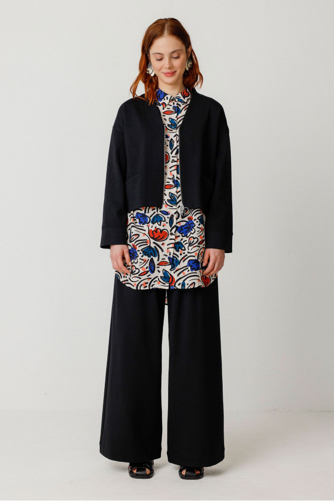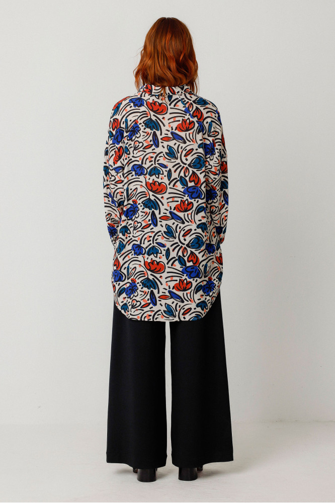 Camisa larga holgada con cuello camisero, de manga larga raglán y cierre delantero de botones, con unos prácticos bolsillos laterales. Estilo informal con un estampado único.