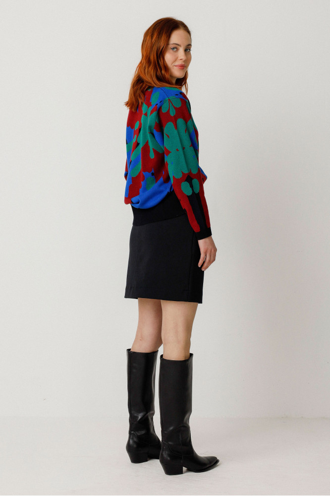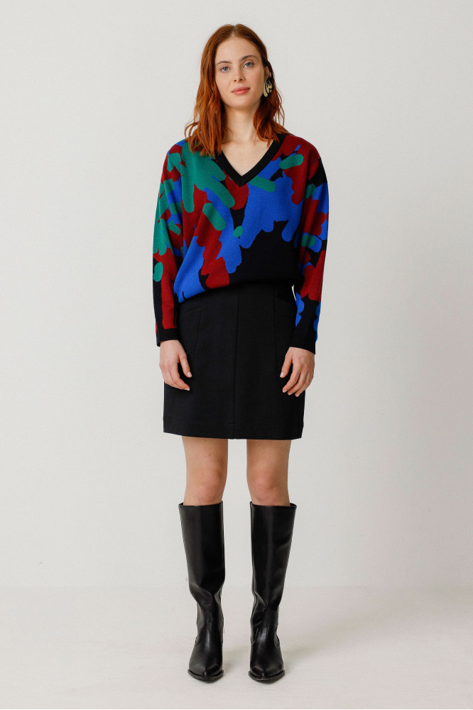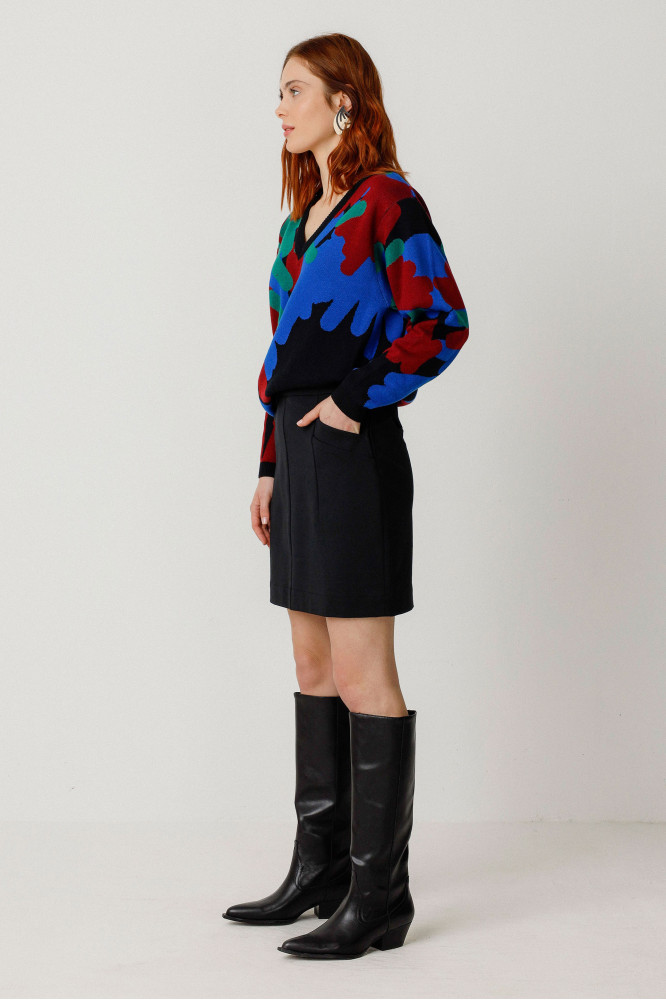 Falda recta por encima de la rodilla con bolsillos delanteros y cierre lateral de cremallera. Combina estilo y facilidad para llevarla.
