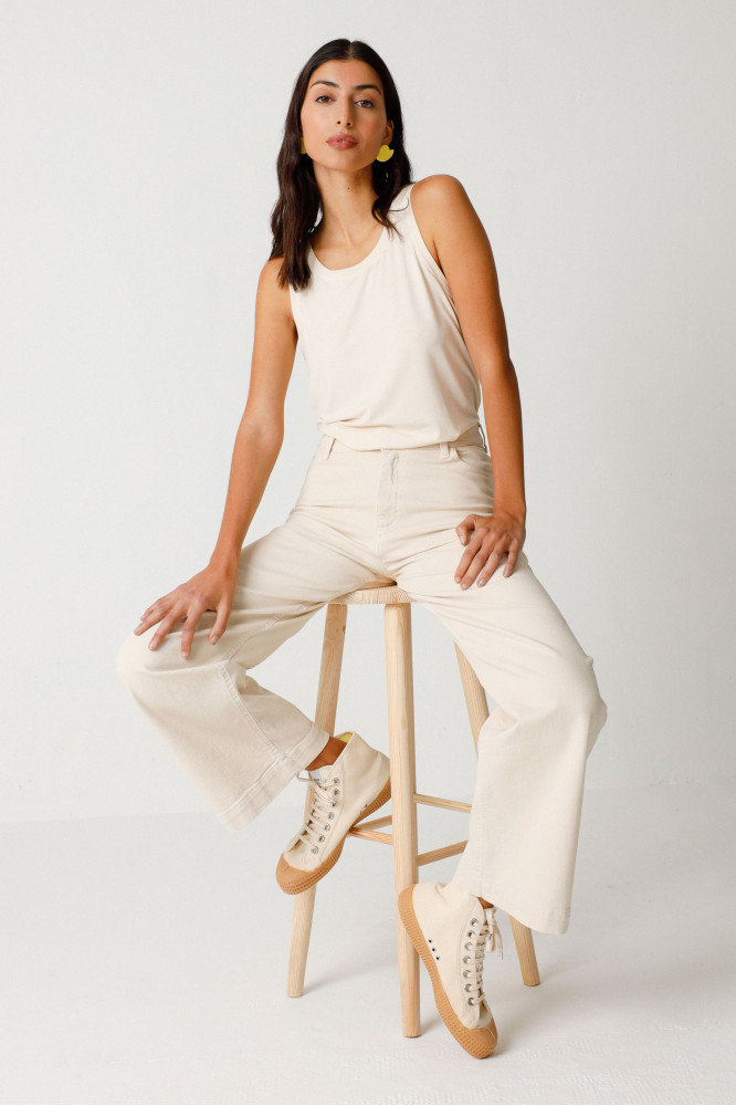 Fabricado en España. Pantalón recto de pata ancha hecho de algodón orgánico elástico. Bolsillos delanteros y traseros y clásica bragueta con cremallera frontal. Crema. Made in SPAIN