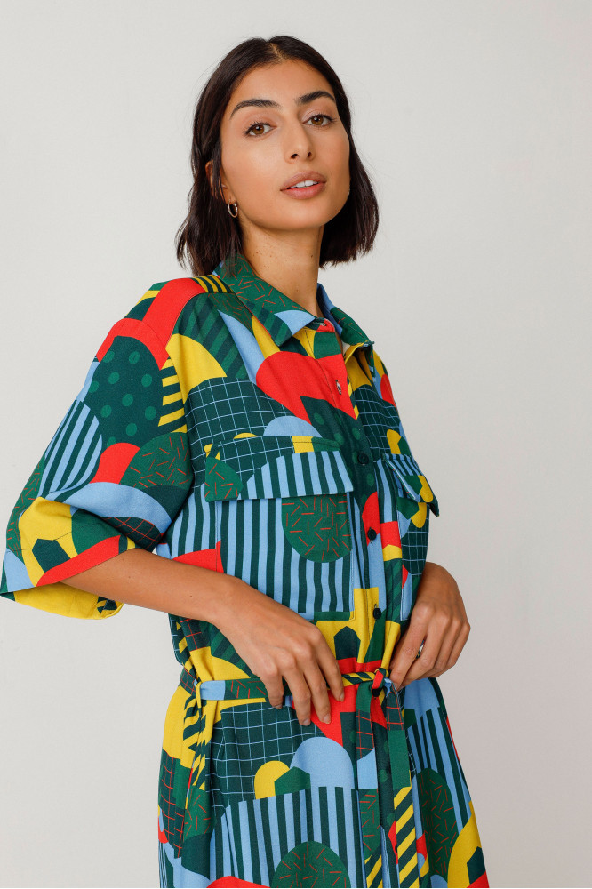 Alkandora-soineko zabala. Mahuka motza, sorbalda eroriak eta alkandora-lepoa. Papar-hegaldun petatxu-poltsikoak aurrean, poltsikoak alboetako josturetan, ixteko botoiak aurrean eta kanezu diagonalak. Gerrikoa desmuntagarria da.