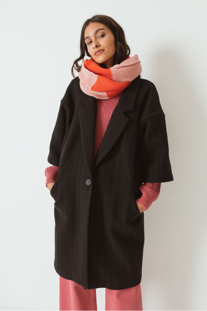 Artilezko beroki zabala, birziklatutako ehun nahasketez egina. Esmokin erako lepoaldea du, botoiekin ixten da, 3/4-eko kimono mahukak ditu eta eskuentzako sakelak. Beltza.