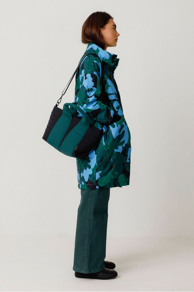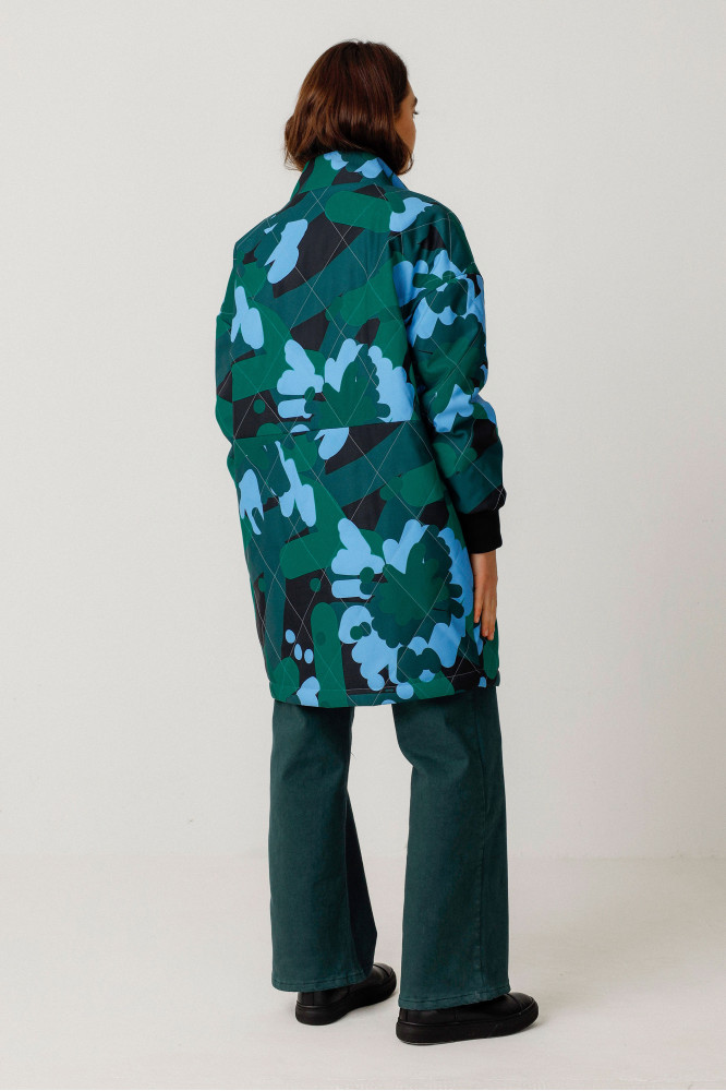 Cocoon formako beroki zabala. Lepo jasoa, kanalezko eskumuturra duen mahuka luzea, poltsikoak eta ixteko botoiak aurrean. Guztiz forratua eta estanpatu koloreanitza. Sorona bigungarria darama.