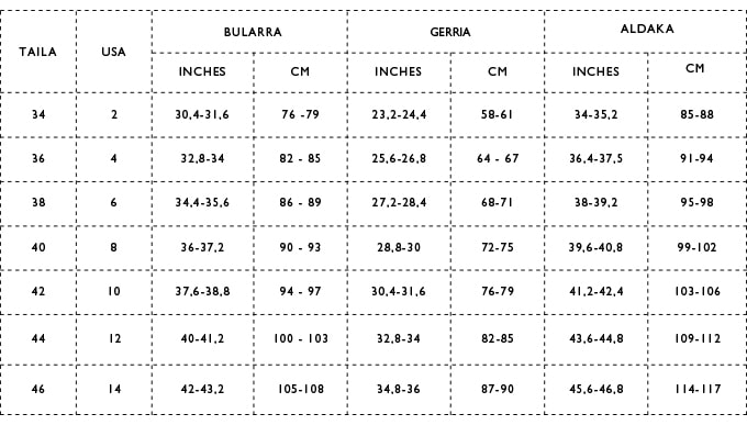Bularraldea - Neurria hartzeko, ingura ezazu gorputza bularra eta sorbalda gehien ateratzen diren puntutik. Justu galtzarbearen azpitik.