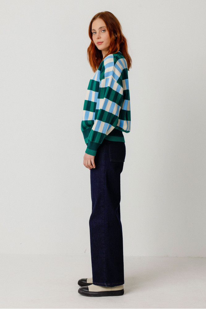 Jacquard puntu egituratuzko jertsea. Lepo biribila, saguzar-mahuka eta kanalezko eskumuturrak. Jantzi eroso eta estilosoa. GOTS ziurtagiria duen kotoi organikoa.
