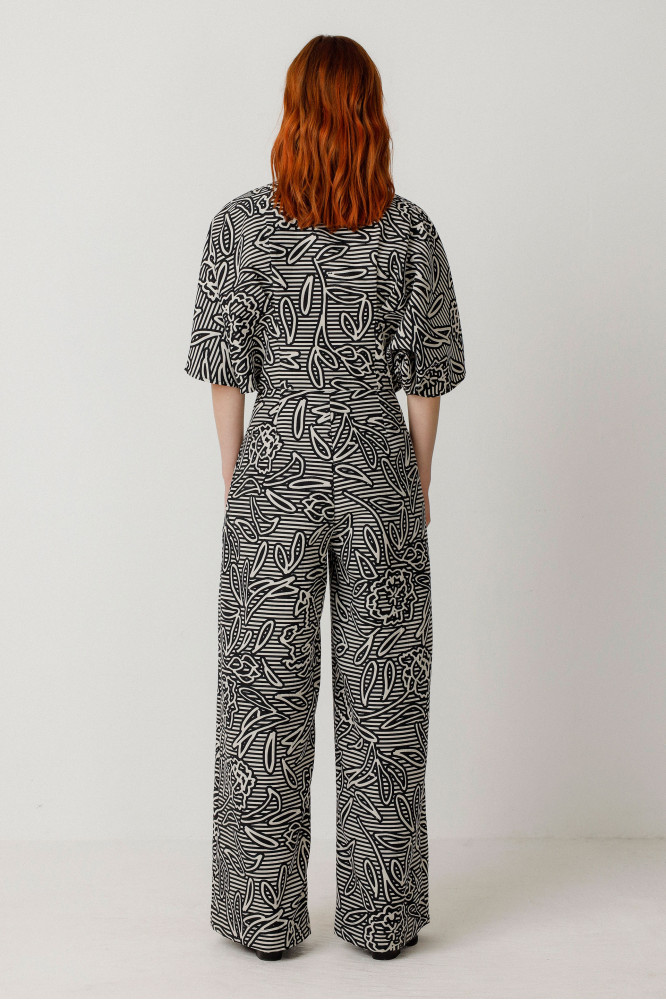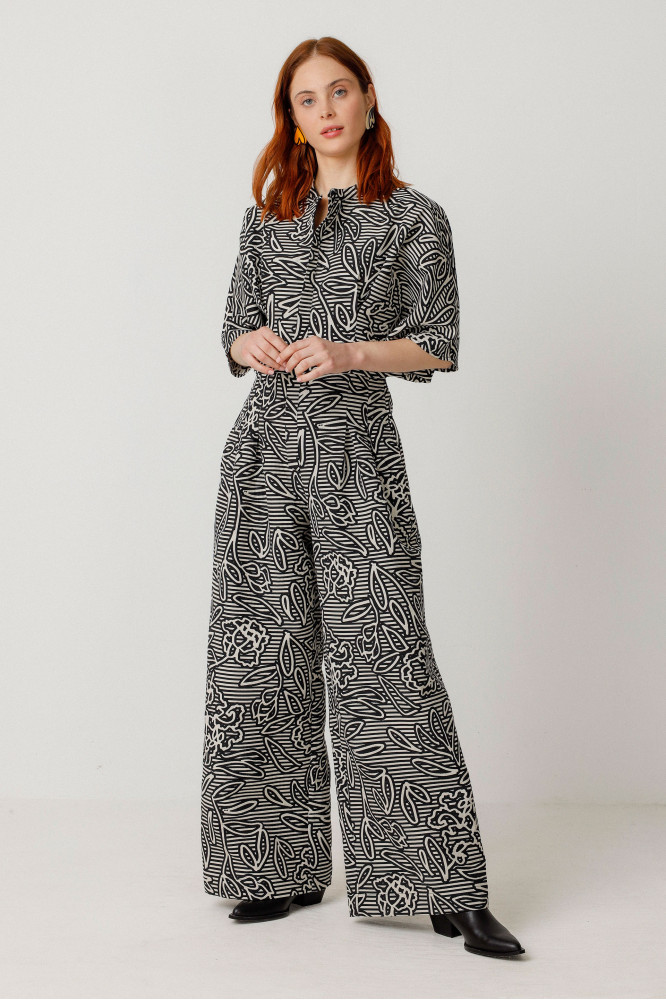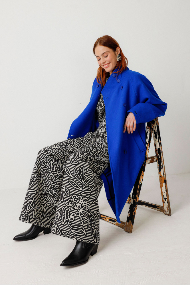 Palazzo lohihartzekoa. Mao-lepoa, kanpai-formako mahuka motza, poltsikoak alboetan eta ixteko kremailera aurrean. Jacquard ehuna. Modako look sofistikatu eta erosoa.