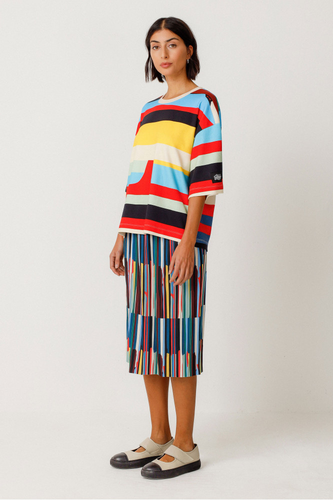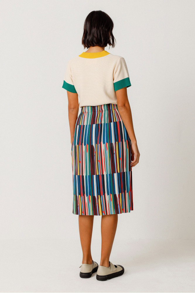 Kanpai-formako midi gona. Gerri elastikoa eta tolesdun ehun fina. Janzteko erraza. Jantzi eroso eta modernoa. Gremsekin elkarlanean.