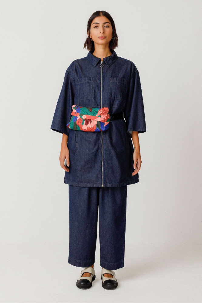 Ehunezko gerriko poltsa. Toles diagonala eta forma zilindrikoa. Ixteko kremailera ezkutua, nylonezko uhal doigarria eta presiozko itxigailua. Neurriak: 254 x 152 mm.