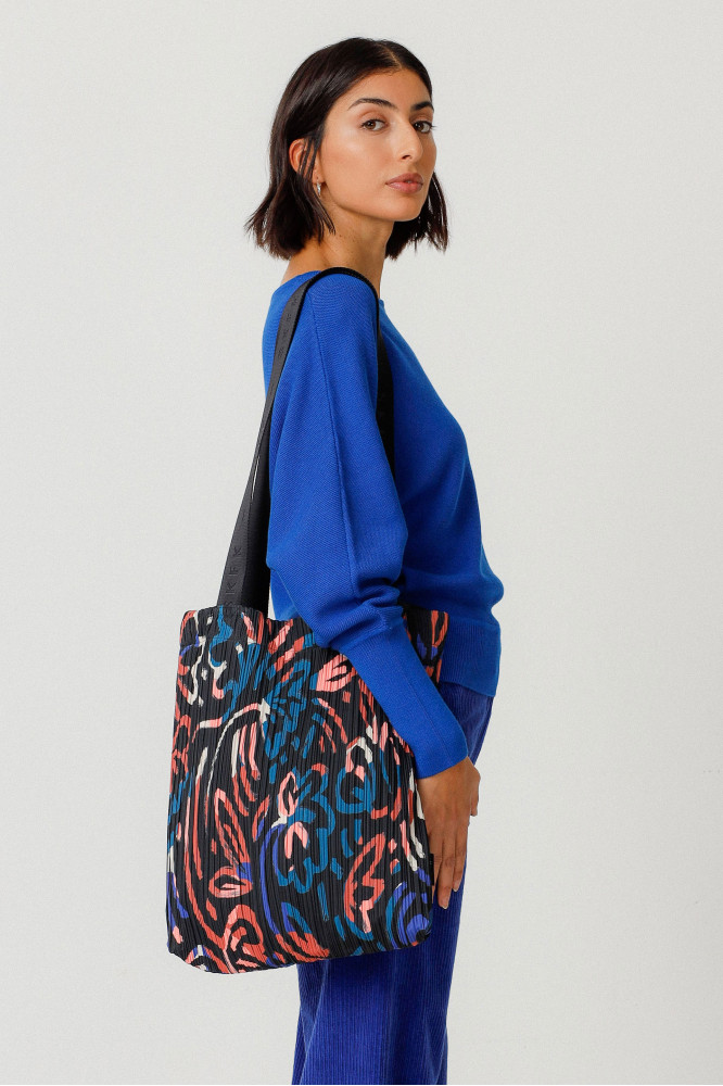 Ehun tolesdunezko erosketa-poltsa. Diseinu estanpatua, ixteko presio-botoia eta heldulekuak. Guztiz forratua. Neurriak: 300 x 400 mm.