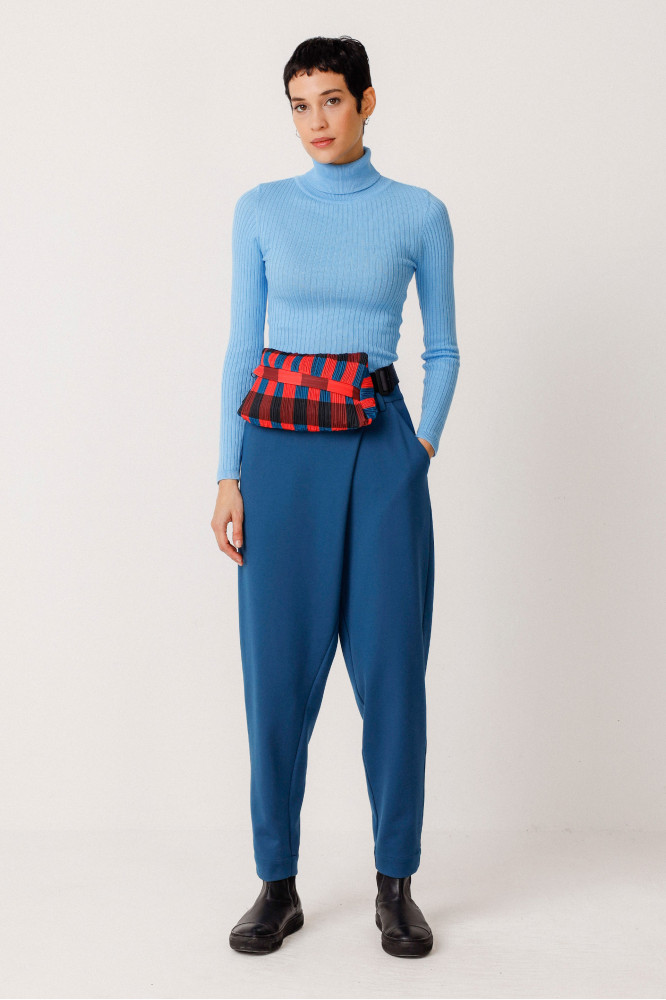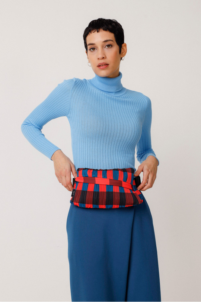 Ehunezko gerriko poltsa. Toles diagonala eta forma zilindrikoa. Irekitzeko kremailera ezkutua, nylonezko uhal doigarria eta presiozko itxigailua. Neurriak: 254 x 152 mm.