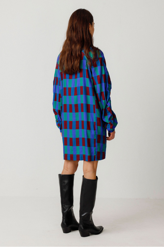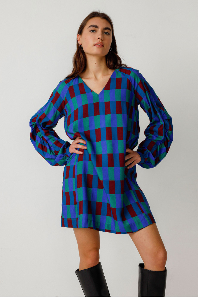 Robe courte évasée avec un col en V, des manches longues à coupe raglan et poignets froncés ainsi que des poches sur les côtés. Modèles à enfilage facile, sans système de fermeture. Motif géométrique multicolore.