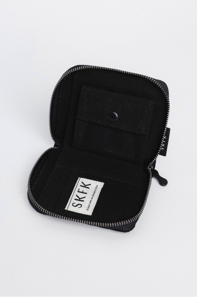 Portefeuille en polyester recyclé avec une fermeture zippée, un porte-cartes à l’intérieur et une poche pour la monnaie. Fonctionnel et écoresponsable.