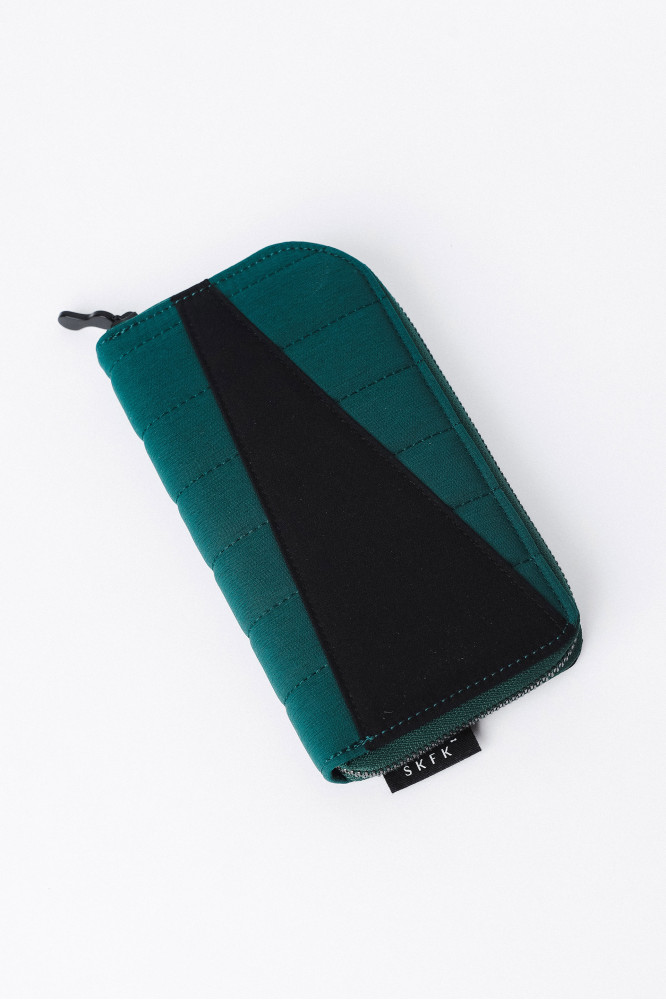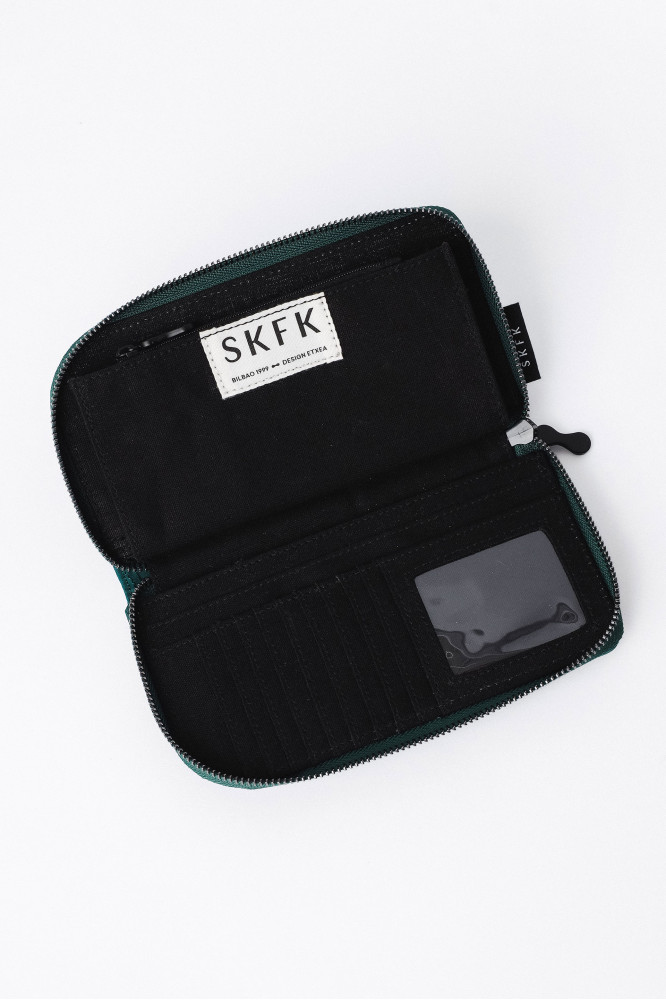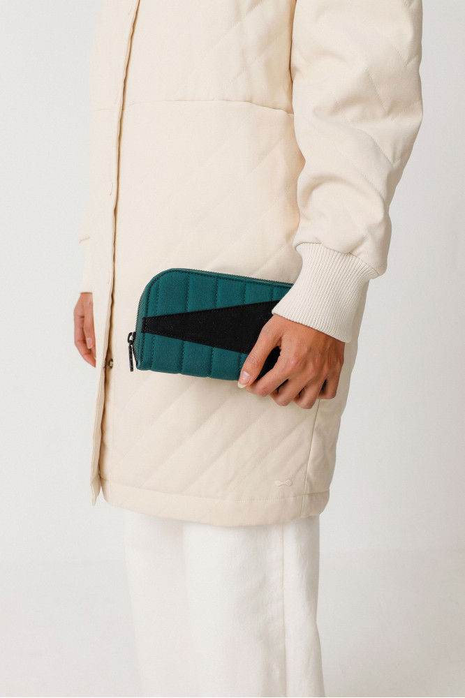 Portefeuille en polyester recyclé avec une fermeture zippée, un porte-cartes à l’intérieur et une poche pour la monnaie. Conception responsable et fonctionnalité.