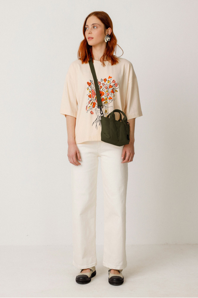 Sac en polyester recyclé avec une sangle ajustable et amovible, une poche intérieure zippée et une doublure imprimée. Dimensions 200 x 140 x 80 mm.