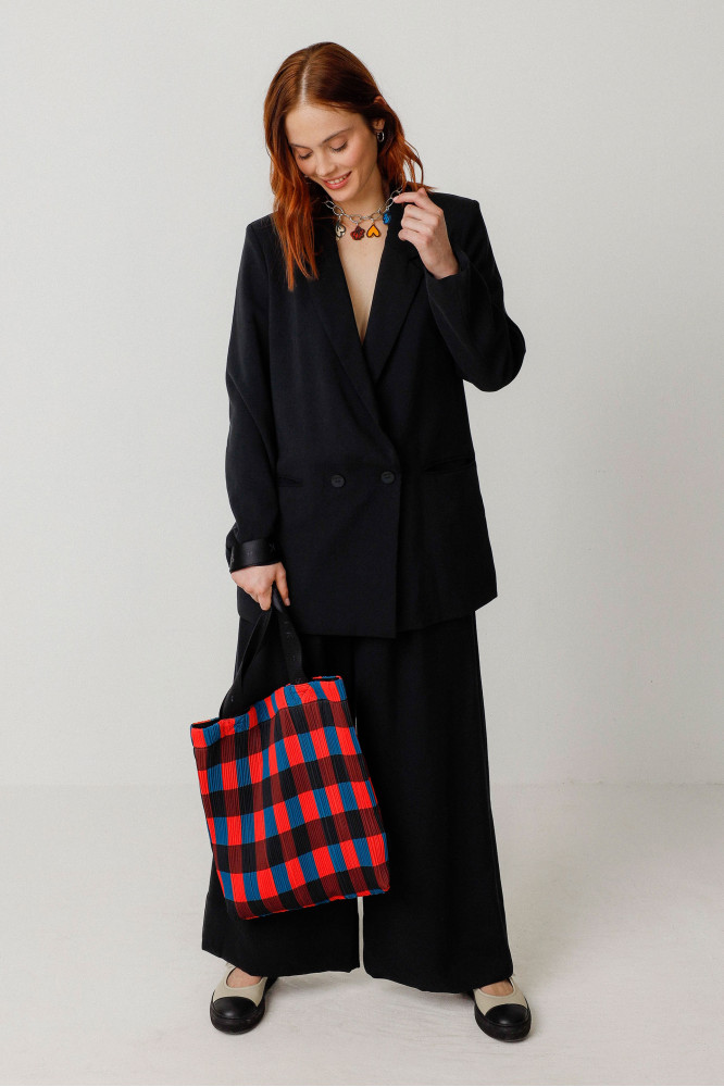 Tote bag dans une matière plissée imprimée, avec fermeture par bouton pression et poignées. Intégralement doublé. Dimensions 300 x 400 mm.